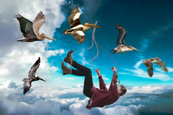 To be caught is to be suddenly stopped and held, whether in the act of wrongdoing or in the moment before disaster. This companion piece to Captured, assembled from nine found photographs, depicts a man in freefall, seemingly doomed, until he is gently snagged in midair by a pod of Pelicans.
