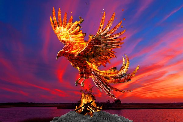 This work, a companion piece to Fordømmelse, was created from 183 found photos, a text layer, and a sunset photo I shot in 2019. The Phoenix is a photo mosaic I created with Adobe Lightroom and Photoshop using images of community service, healing, therapy, neighbors, forgiveness, family, rehabilitation, and prison opportunity-based programs such as guide dog training, firefighting, and parenthood while incarcerated. I included a few images of baby birds being held and a white dove of peace.