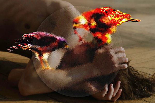 This piece consists of three found photos and one geometric shape, seamlessly blended using a clipping mask and multiple filters to create a frosted glass effect. At its center, a shirtless man lies on the floor, covering his head in despair. Two Hawks tear at his flesh, their violence obscured but not entirely hidden by the glass. The frosted glass serves as a metaphor for society’s awareness of prison conditions—seen but willingly blurred to avoid confronting the raw reality.