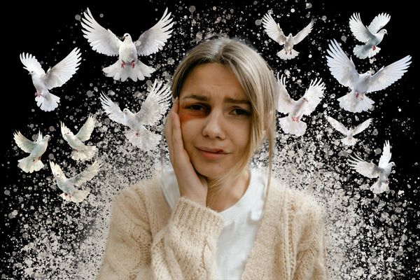 This work is composed of eleven found photographs arranged to form the image of a battered woman. Tears stream down her cheeks, and she cradles her own bruised face as she dissolves into a flock of snow-white Dove, a symbol of the innocence stolen from her. The splatters represent the blood spilled during violent assaults and shootings. Including a collage dedicated to victims was essential to reinforce that they are not forgotten. Treating their attackers humanely does not diminish justice; rather, it strengthens it by helping to break the cycle of recidivism, creating a path toward true accountability and lasting change.