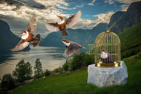 This piece consists of seven layers created from six found photographs. The golden cage layer was duplicated and manipulated to position the bird inside, while leaving the door open — a metaphor for Norway’s prison system, which emphasizes rehabilitation and reintegration. The birds featured are White-throated Dippers, Norway’s national bird, symbolizing hope, resilience, and adaptability in challenging circumstances. Three Dippers fly freely, while one remains in the cage, representing Norway’s remarkably low 25% recidivism rate. The backdrop of the Norwegian landscape further reinforces the themes of freedom, natural beauty, and the country's progressive approach to criminal justice.