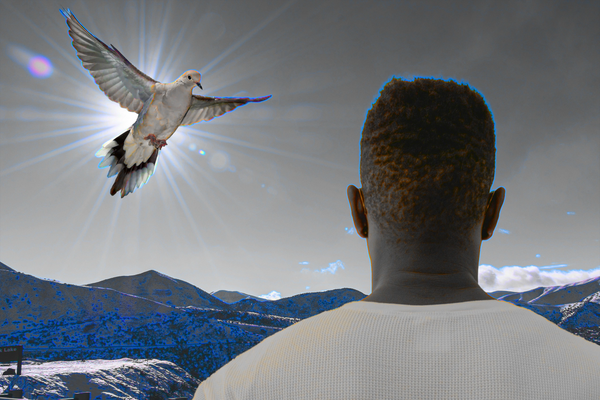 Remorse is an emotion that centers on the guilt for harm one has done to others. This piece, a companion to Regret, consists of three found photographs, combined to depict an inmate gazing at the sky over a distant mountain range. A Mourning Dove, symbolizing sorrow, appears in the sunlight, its presence underscoring the weight of his regret for his crimes. The mountains represent the self-imposed obstacles he now faces, a stark reminder of the mistakes he’s made. Filters have been applied to the entire image, distorting and desaturating it to reflect the irreversible shift in his life’s direction.