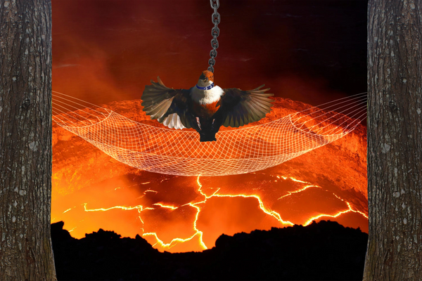 This piece serves as a companion to Freefall (Part 1) and consists of six found photos, with Norway’s White-throated Dipper once again taking center stage, symbolizing an inmate in the Norwegian rehabilitation prison system. The bird, restrained by a collar and suspended above molten lava by a short chain, with the tension keeping him suspended safely above the lava below. Flanking the scene, two trees support a net positioned beneath the Dipper, ready to catch him if needed. The open volcano serves as a metaphor for the perilous cycle of criminal behavior and recidivism, while the net and short chain represent the structured rehabilitation programs designed to guide inmates toward change and reintegration.